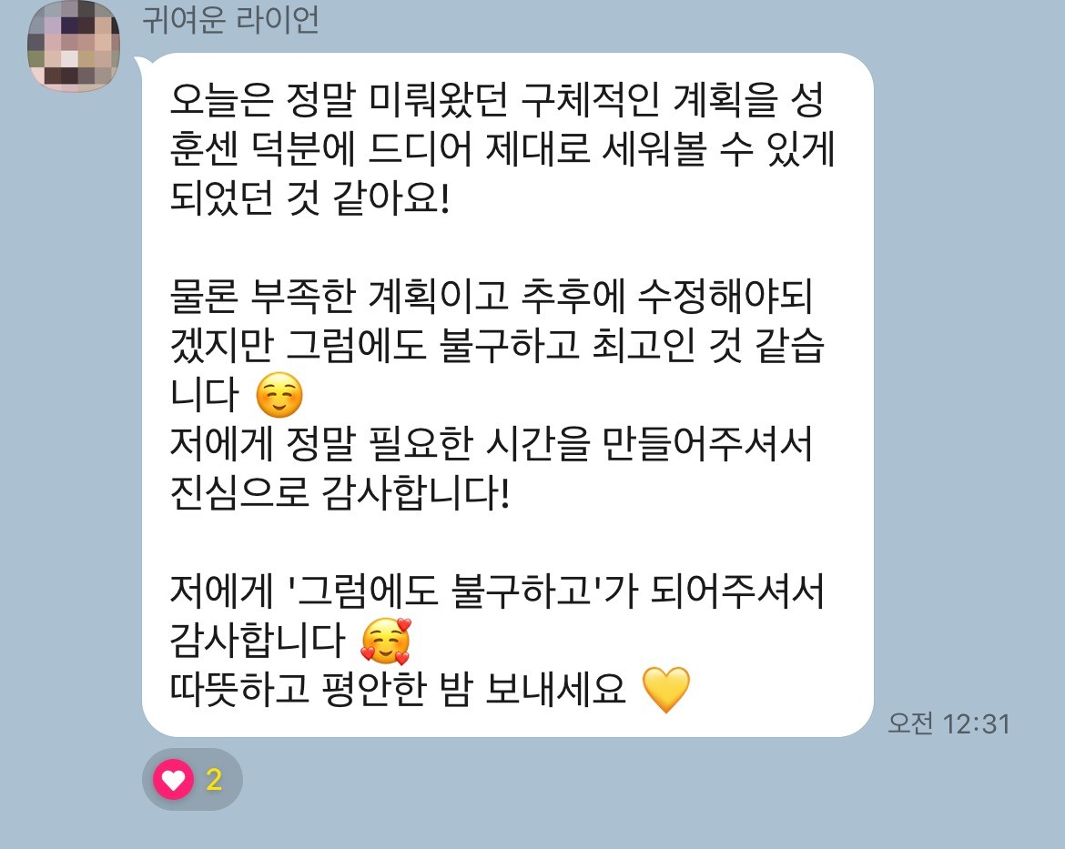 7일동안 매번 주시는 질문에 답을 하면서 쓰는 글쓰기는 목적이 있는 글쓰기, 그리고 코칭이 얼마나 중요한지 알게되었다. 나를 가이드해주는 질문 덕분에 나는 나를 자세히 볼 수 있었다. 그저 내 감정을 알아주는 차원을 넘어서 나의 단점도 나의 문제도 확실히 보았고 나의 삶의 모든 면을 돌아볼 수 있었다. ​
