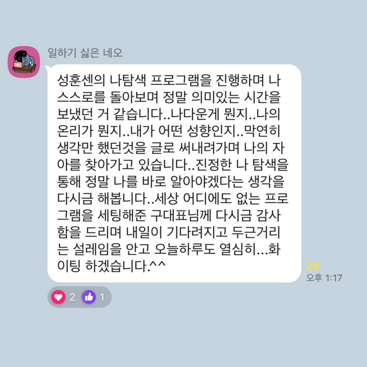 성훈센의 나탐색 프로그램을 진행하며 나 스스로를 돌아보며 정말 의미있는 시간을 보냈던 거 같습니다..나다운게 뭔지..나의 온리가 뭔지..내가 어떤 성향인지..