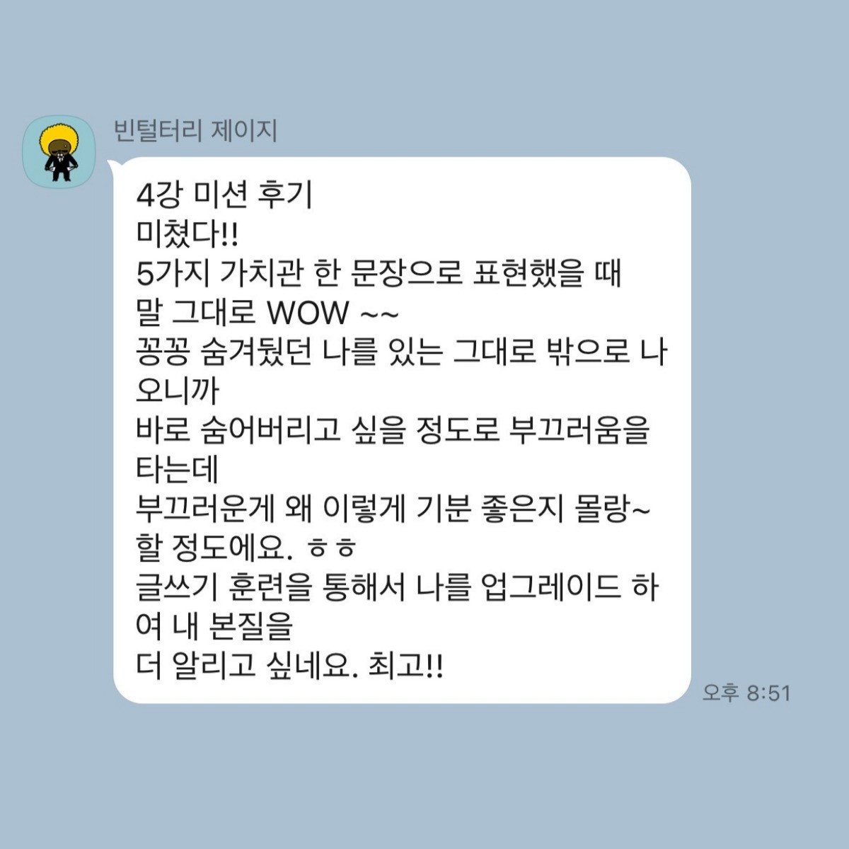 저에 대해 이렇게 심도 있게 고민해본 적은 처음이었습니다 이러한 시간이 다소 오글거리고 낯설지만 정말 새로운 경험이자 유익한 경험이라고 생각합니다